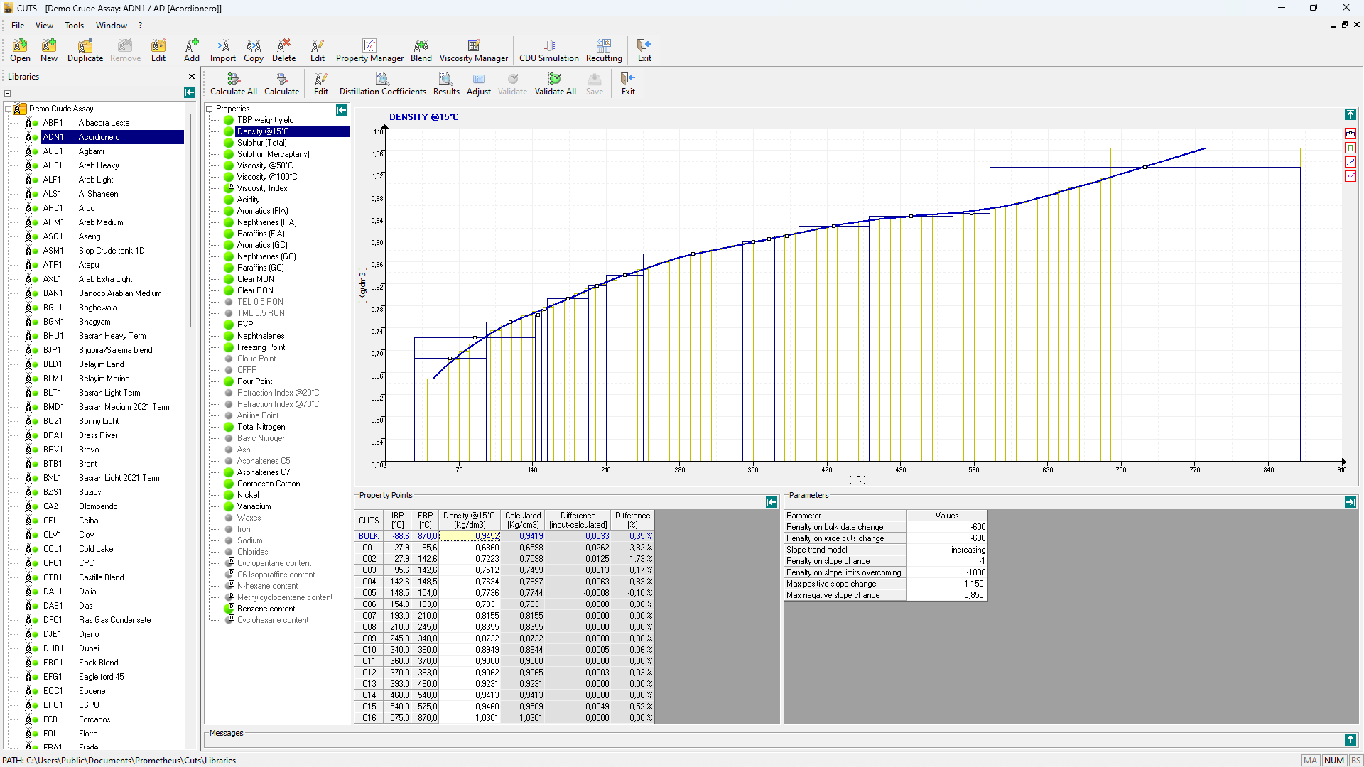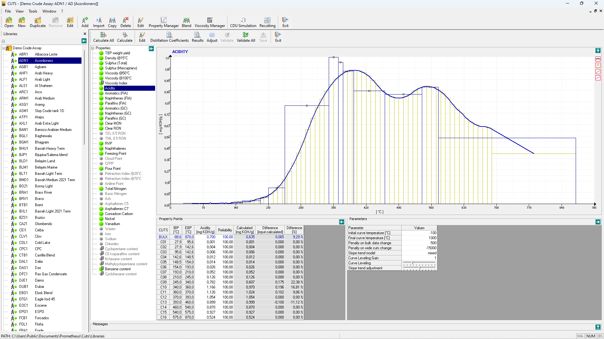 CUTS characterises every Crude Oil as a mix of pure components and “pseudo-components” (narrow fractions of 10°C), covering the entire boiling range. CUTS calculates the values of appropriate quality characteristics for each pseudo-component. The software distributes properties of the original assay, finding the best agreement between the natural curve shape and the input data.